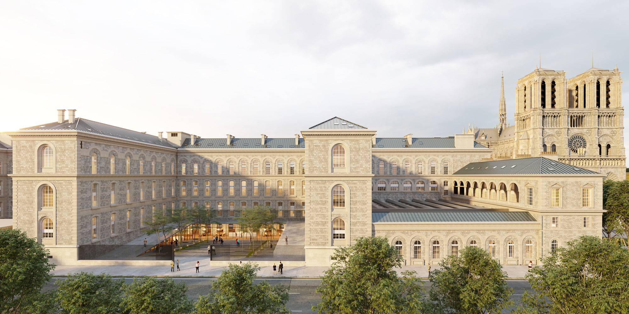 La restructuration et l’extension de Nancy Thermal marie patrimoine et modernité pour redynamiser tout un quartier, à travers l’attractivité du plus grand établissement thermal de France, avec des activités pluridisciplinaires autour de l’eau. Activité médicale, thermalisme, bien-être, sport, loisirs sont autant d’usages transgénérationnels regroupés sur un même site. Les bâtiments auront un lien fusionnel avec le parc Sainte-Marie qui a été créé à l’occasion de l’exposition universelle de 1909. La reconstruction de la gare de Vilnius en Lituanie et de son quartier est pour sa part une œuvre à la fois poétique, véritable manifeste technique doté de panneaux photovoltaïques verticaux pour répondre aux réalités climatiques, qui va permettre de relier le quartier historique et le nouveau quartier de Vilnius. Enfin, je mentionnerai la requalification de l’Hôtel-Dieu à Paris, à deux pas de la Cathédrale, en centre de recherche médical. Ce projet prévoit une nef en son cœur. C’est l’occasion de revitaliser et d’ouvrir l’Hôtel-Dieu sur la cité et d’en faire le vaisseau amiral de l’AP-HP en matière de diagnostic médical.