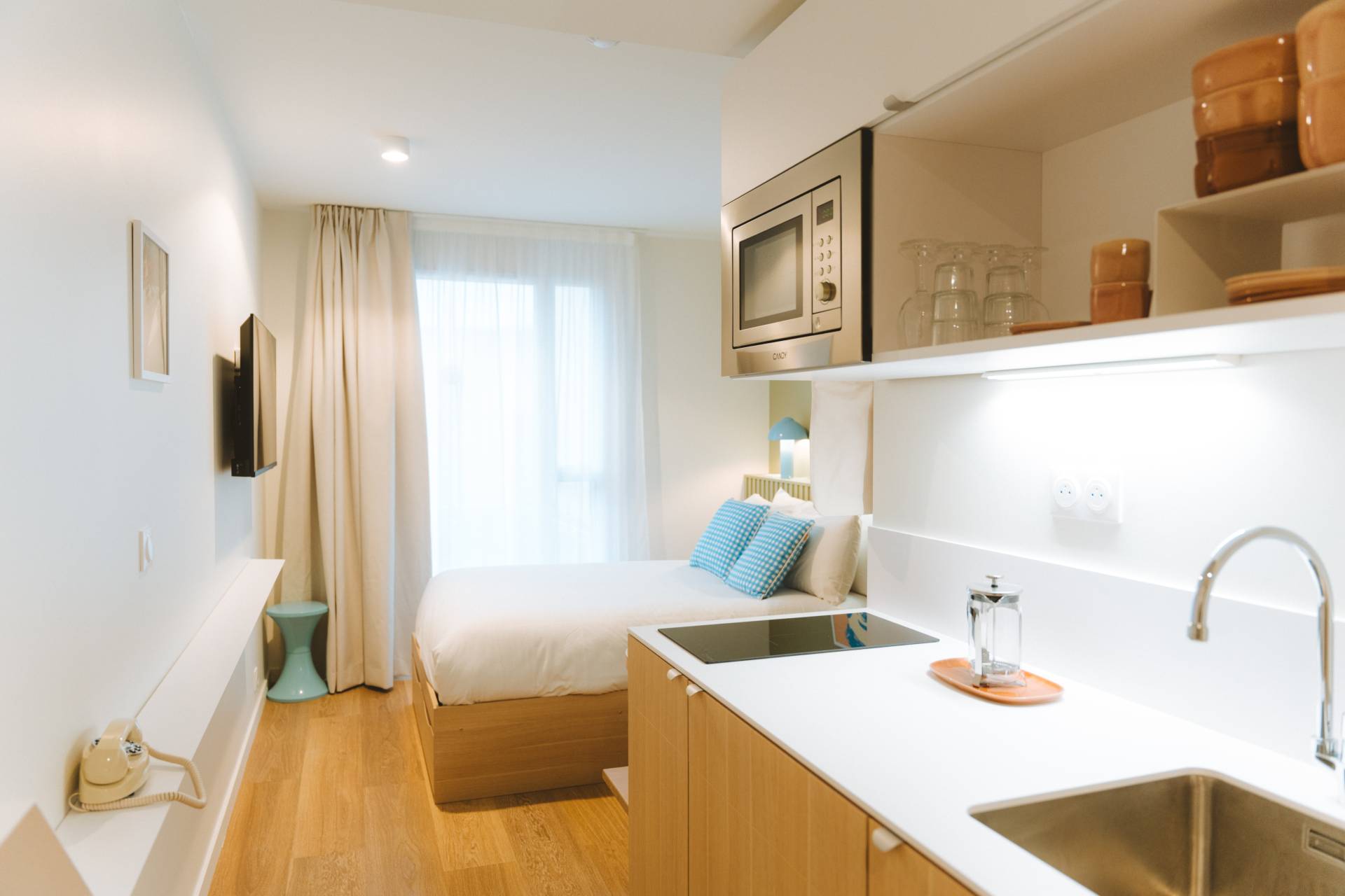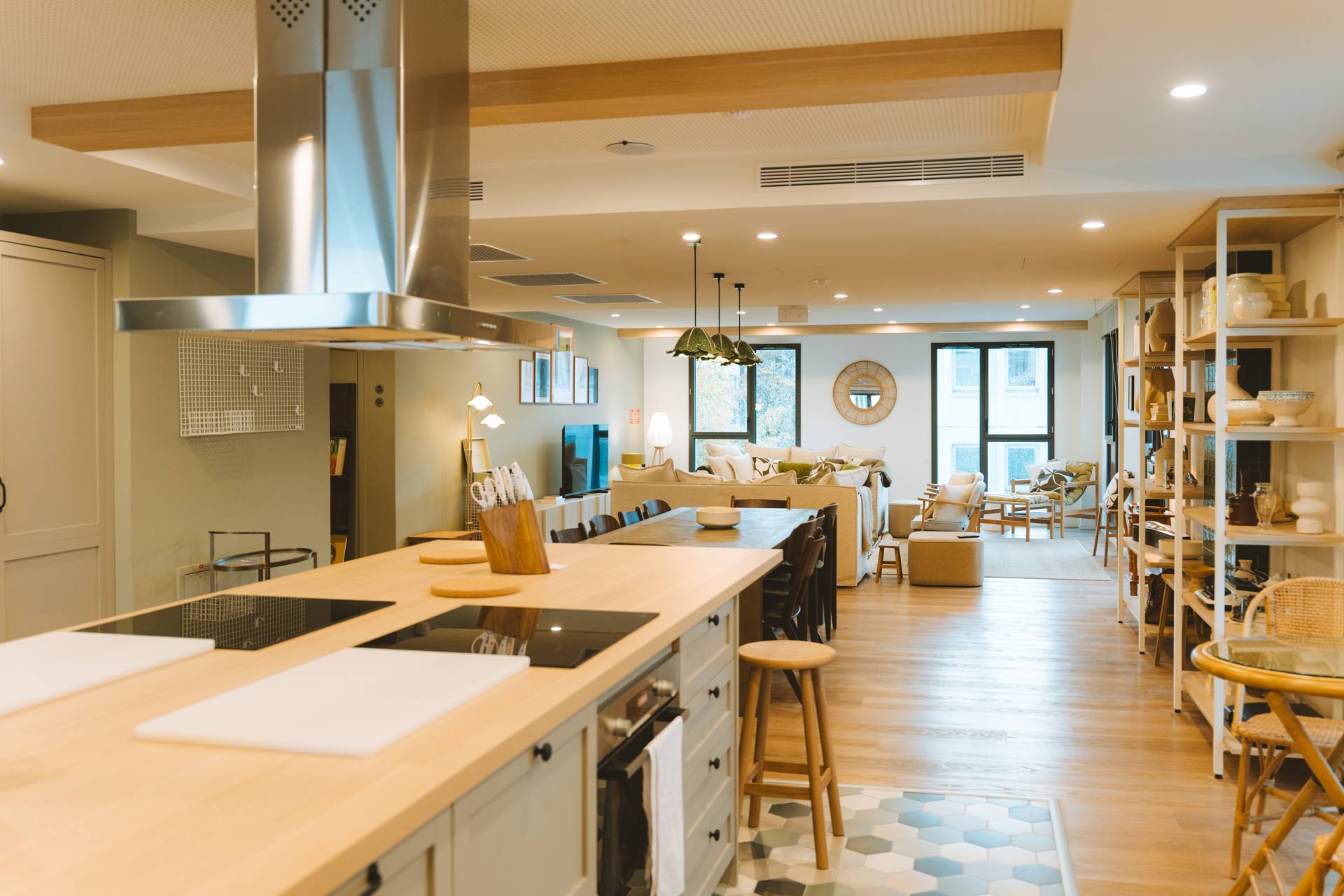 Trois étages proposent une grande pièce à vivre à l’ambiance cosy où les résidents de long séjour se sentent comme dans une grande maison. Digne d’un chef, leur cuisine offre deux plans de travail en vis-à-vis, de grands frigos et des tiroirs débordant d’ustensiles. Elle est prolongée d’une table conviviale et d’un salon agrémenté de plusieurs canapés et fauteuils particulièrement confortables. Ni le wifi ni la platine vinyle, les livres et les objets chinés dans les brocantes lyonnaises ne manquent à l’appel. Qu’ils soient résidents ou non, les amis sont les bienvenus.