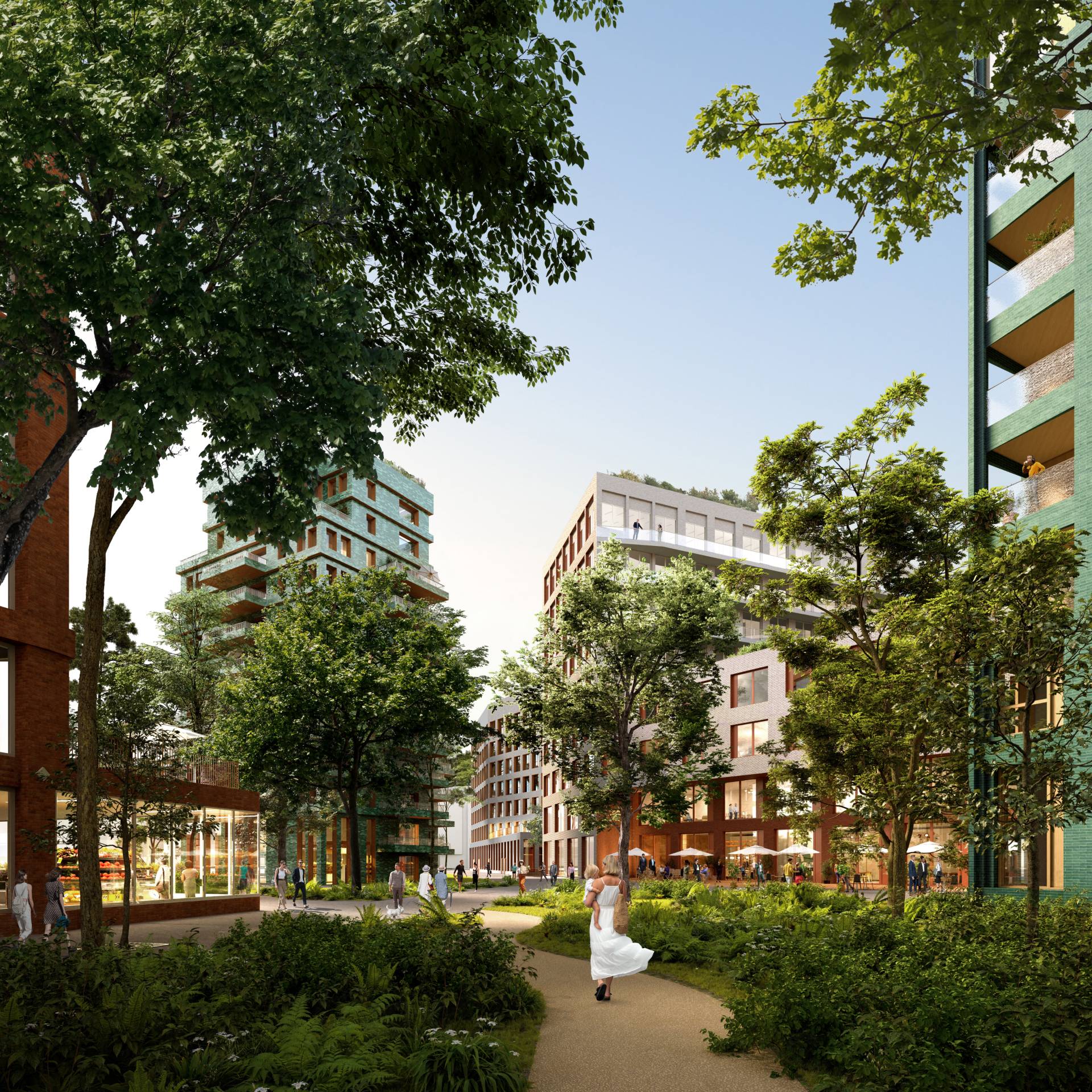 À l’heure de l’urgence climatique, la nature et la préservation de l’environnement possèdent une place singulière dans cet écoquartier. Sur les trois hectares du site – qui jadis était très minéral –, 8 000 m2 d’espaces paysagers seront créés, dont plus de 6 000 m2 en pleine terre. Dans le détail, 250 arbres sont projetés quand 30 d’entre eux sont préservés pendant les travaux. « Ce parti pris s’inscrit parfaitement dans la stratégie environnementale de VINCI Immobilier, qui vise à atteindre le zéro net d’artificialisation d’ici 2030 », pointe Agnès Joliot. Le réemploi d’un maximum de matériaux de l’ancien siège de la MEL est également mis en œuvre par R-USE pour les édifices de bureaux et logements. Plusieurs certifications et labellisations sont visées : HQE Bâtiment Durable, Breeam, Wired Score, NF HQE Habitat et Produit Biosourcé, E2C1 et Biodivercity Ready/Ready 2 Services. En matière de mobilités douces, plus de 2 200 m2 seront dédiés aux piétons et cyclistes – notamment au travers de l’aménagement d’un square intérieur conçu comme une place de village. « De par sa position géographique, cet écoquartier sera connecté à une foison de mobilités : deux stations de vélos V’lille, le tramway, la ligne 2 du métro et bien sûr les gares Lille Europe et Lille Flandres », cite Philippe Clément. Enfin, pour ne pas consommer davantage de foncier, toutes les places de parking réservées aux voitures seront systématiquement aménagées dans les sous-sols des immeubles.