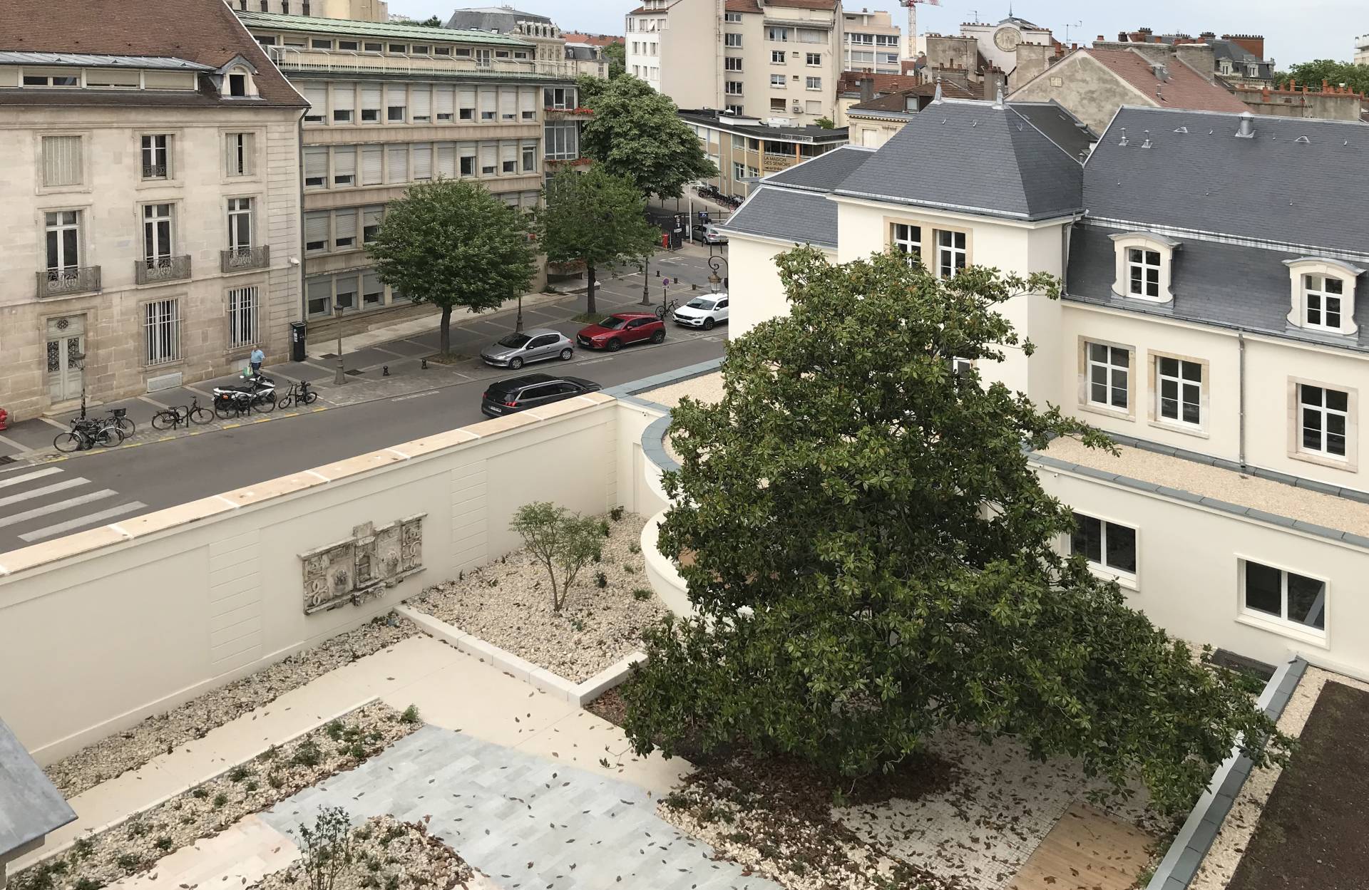 Afin de limiter au maximum les nuisances pour les riverains pendant les deux ans qu’a duré ce chantier ambitieux, des techniques de « grignotage » et de « phasage » ont été mobilisées afin d’éviter les frictions et de réduire les suspensions de poussière. « Pendant la phase de destruction, nous avons choisi de découper plutôt que de broyer », précise Gilles Toulon. La réhabilitation du cloître, des toitures et des escaliers monumentaux, a été pensée comme une série d’opérations d’allégement. Le site a ainsi été libéré des multiples locaux techniques, des annexes et des garages autrefois dédiés au fonctionnement de la clinique.