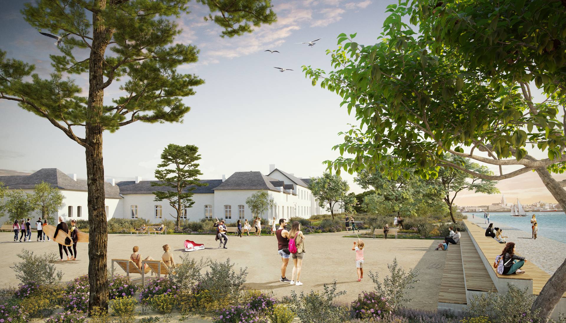 Si la mixité est le maitre-mot pour la biodiversité, elle l’est également pour la programmation. La chapelle de Pen Bron, déjà désacralisée, sera conservée et gardera sa vocation culturelle et événementielle. Dans ce qui est aujourd’hui le carré de l’hôpital, sera demain installé un hôtel d’une centaine de chambres. A l’arrière, on trouvera des locations touristiques – une centaine d’hébergements– et, pour rappeler la dimension sociale et médicale de la presqu’île, une maison de répit sera réservée aux aidants et aux aidés. Il s’agit d’un lieu de vacances de court ou moyen séjour, permettant à l’aidant et la personne qui l’accompagne au quotidien de se ressourcer ensemble, se distraire dans un cadre relaxant, avec des animations et un encadrement spécialisé.